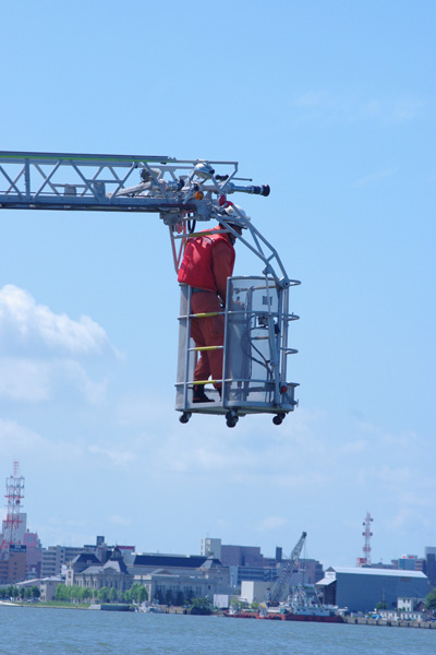 ・その後、消防のはしご車をつかい、救助する・・・という訓練だそうな。