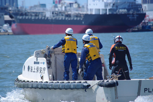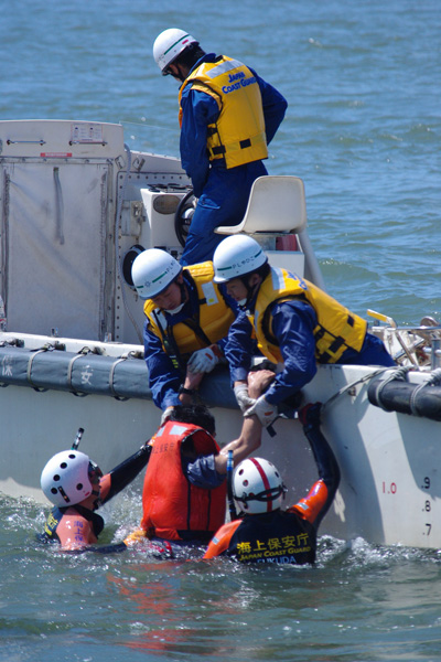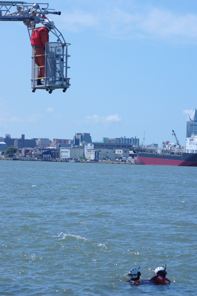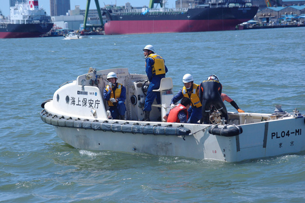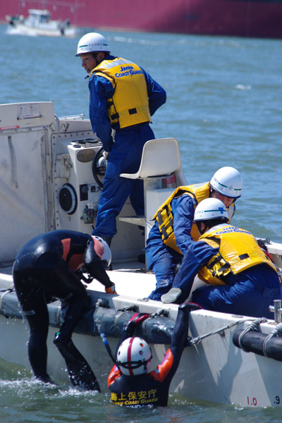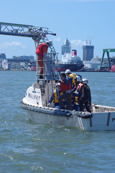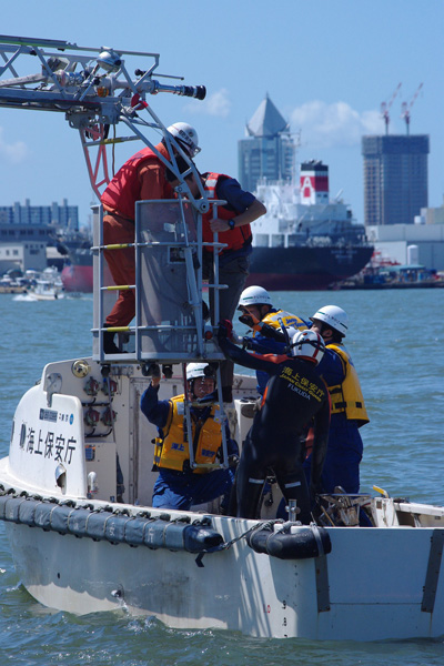 ・海に落ちた要救助者を海保の潜水士が確保し、警救艇に引き上げる。
