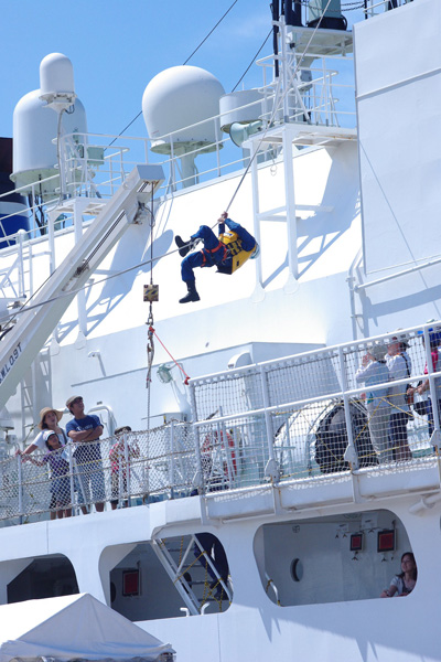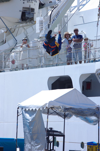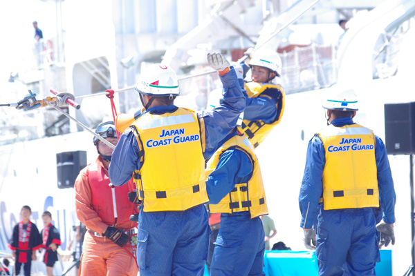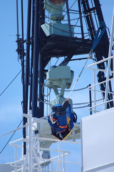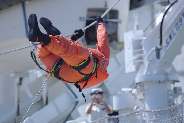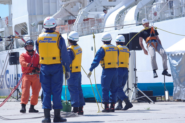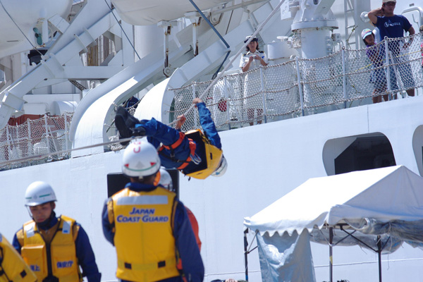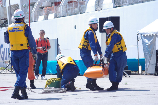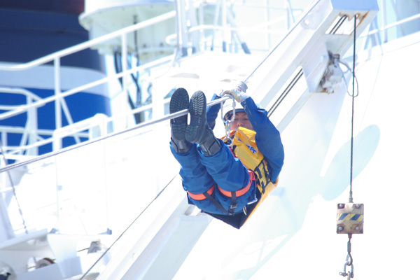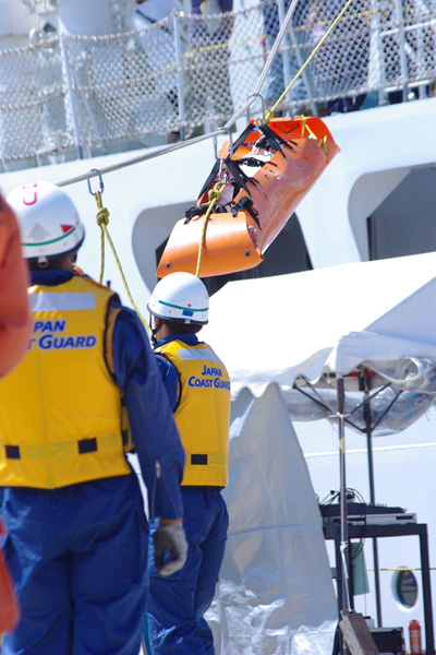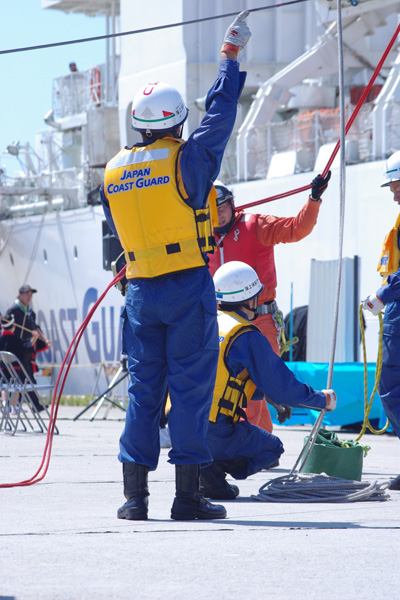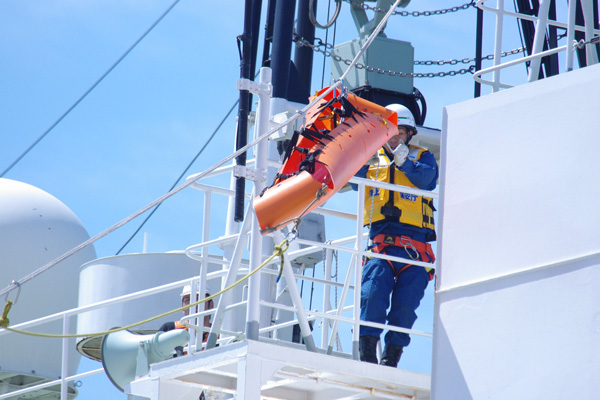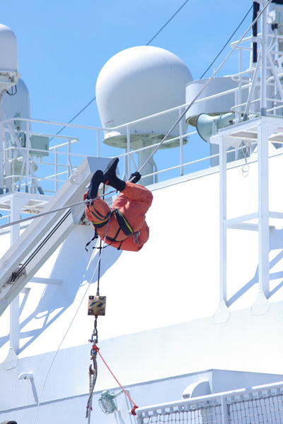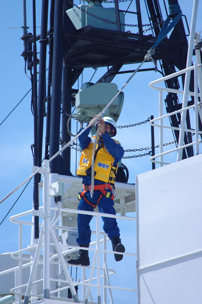 ・続いては巡視船と車輌の間にロープを張り、船からハーネスとタンカ?を